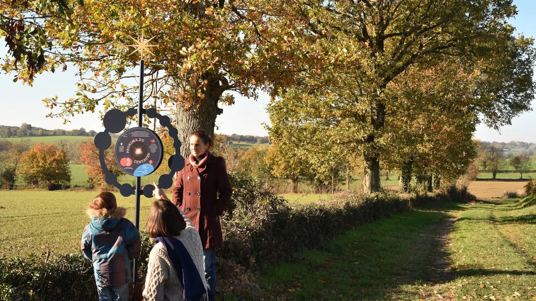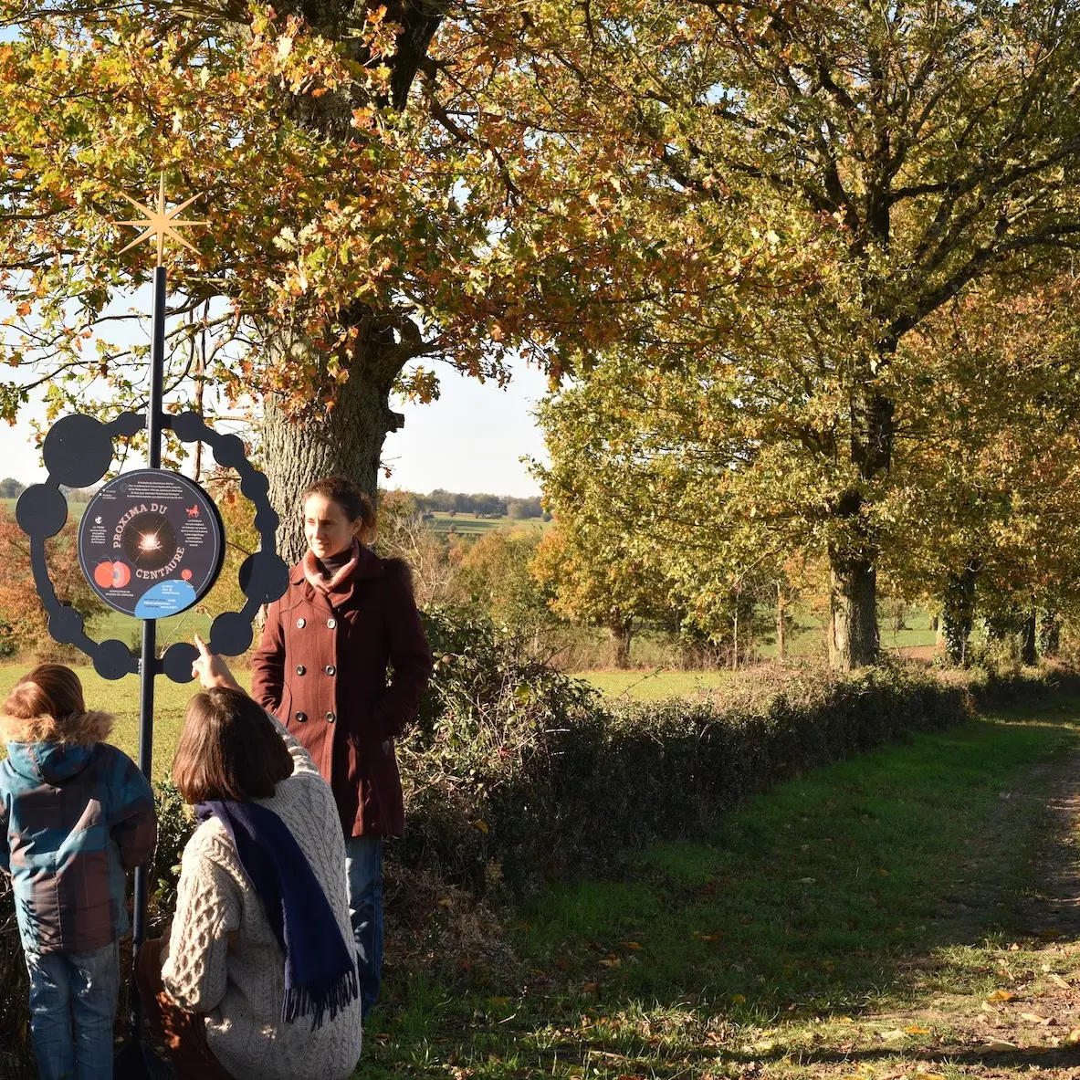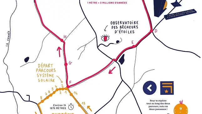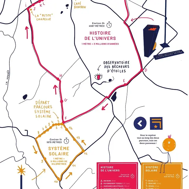 The Chemin aux étoiles reflects this feeling by creating two walking trails, with markers to help you discover: the History of the Universe (4.6 km) and the Solar System (1.7 km).