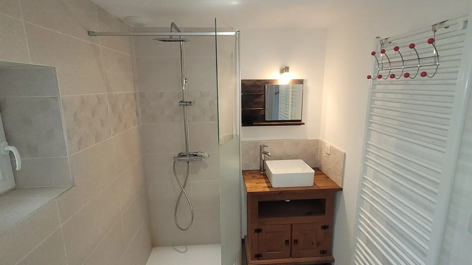 Bathroom with Italian shower, vanity unit and heated towel rail (hairdryer provided).